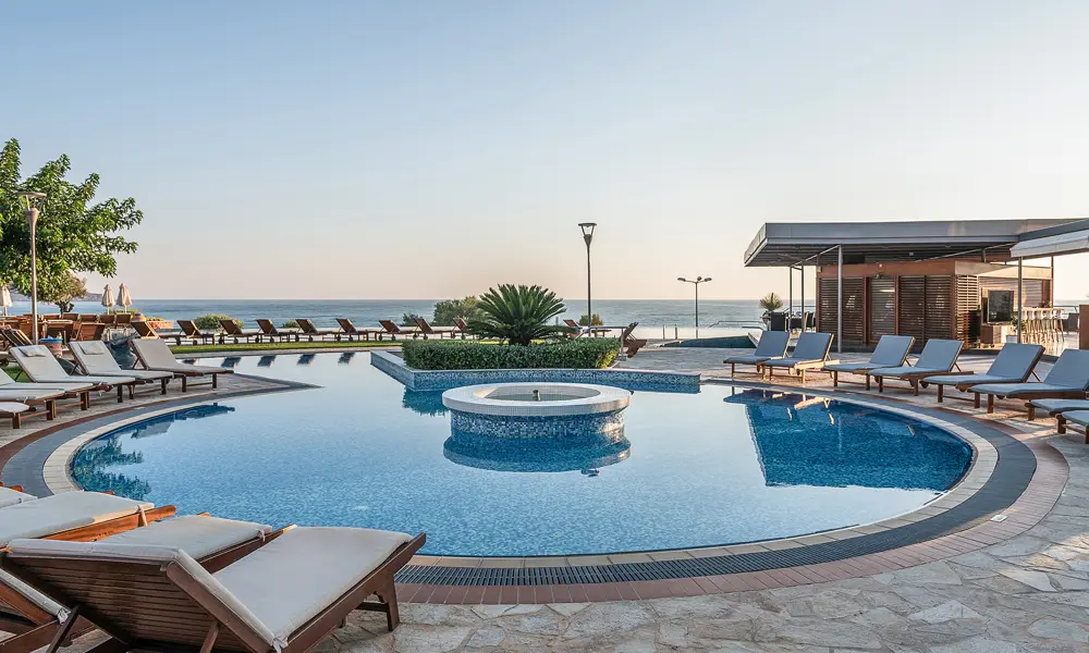 Poolområdet er hotellets naturlige samlingspunkt og et hyggeligt omdrejningspunkt for feriedagene på Cretan Dream Resort & Spa. Den store, indbydende infinitypool ligger med flot udsigt over havet og indbyder til både svømmeture og rolige stunder på solsengen. Rundt om poolen står komfortable solsenge og parasoller, og ved poolbaren kan hele familien hente kolde drikke, is, snacks og cocktails i løbet af dagen.