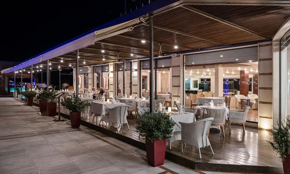 Cretan Dream Resort & Spa tilbyder et varieret udvalg af restauranter og barer, der dækker hele dagen. Start morgenen i Aphrodite Restaurant med stor international morgenbuffet krydret med lokale specialiteter. Til frokost og middag serverer Muse À La Carte Restaurant moderne retter baseret på friske, lokale råvarer.