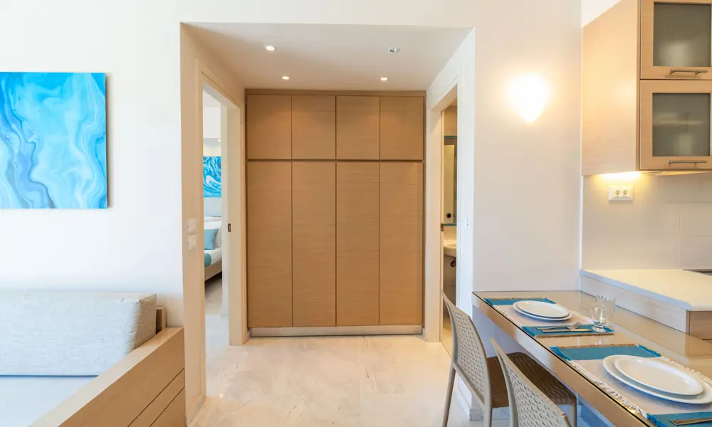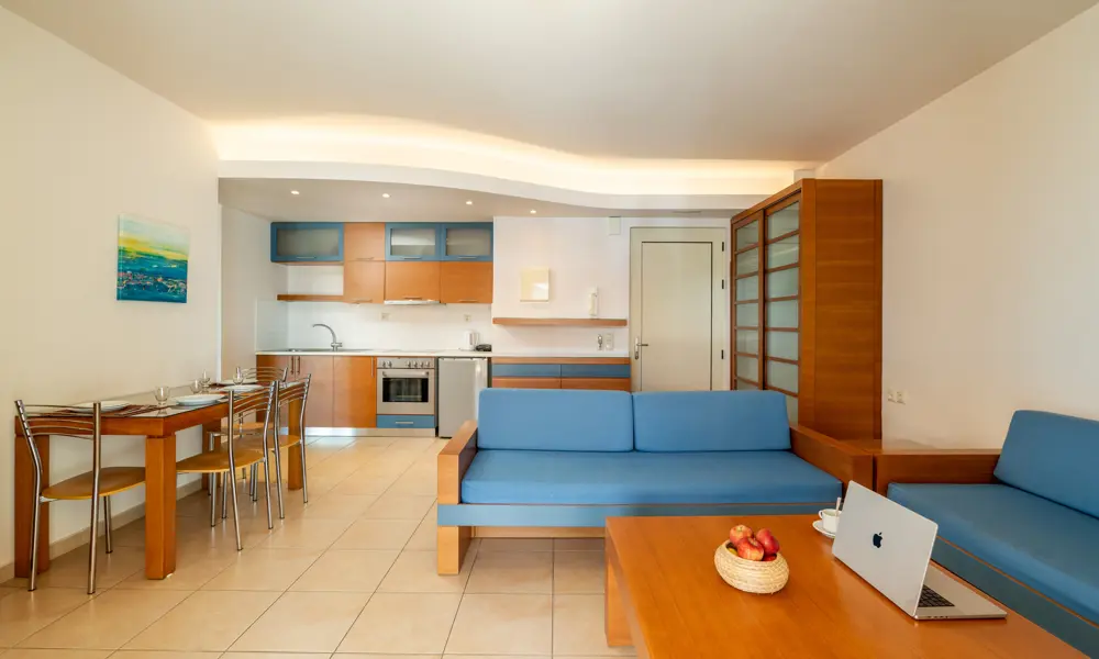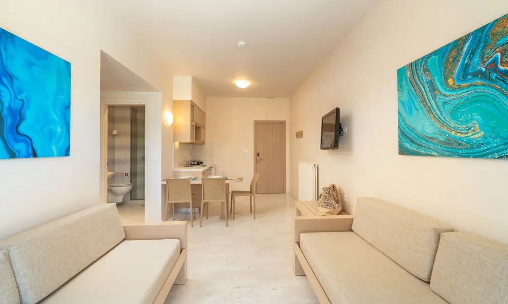 De 2-vær. lejligheder er på 30-36 m2 og er placeret i stueplan eller på 1. sal i hotellets hovedbygning eller i bygningen nærmest havet. Lejlighederne har blandt andet separat soveværelse med dobbeltseng eller to enkeltsenge. Opholdsrummet har to sovesofaer som måler: Bredde 80 cm. Længde: 195 cm.