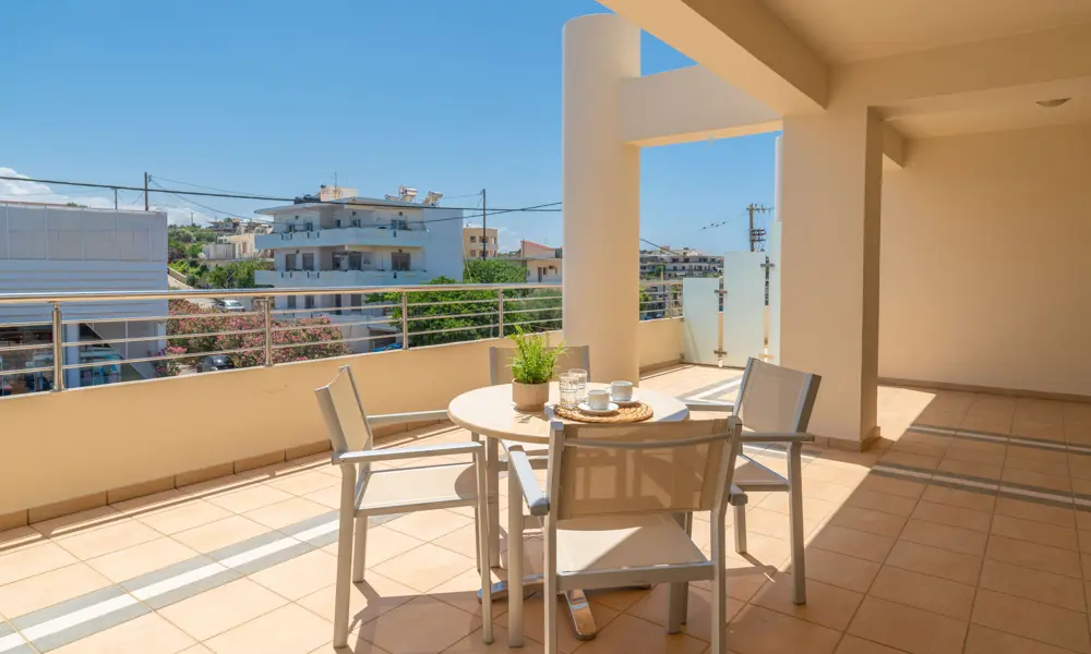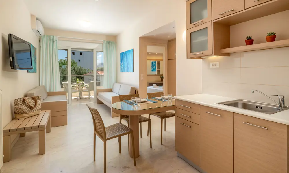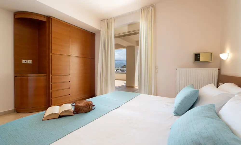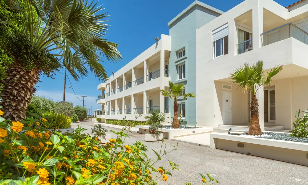 Du bor dejligt på Hotel Kedrissos og de velindrettede boliger med egen balkon fordeler sig over 12 dobbeltværelser og 40 lejligheder.