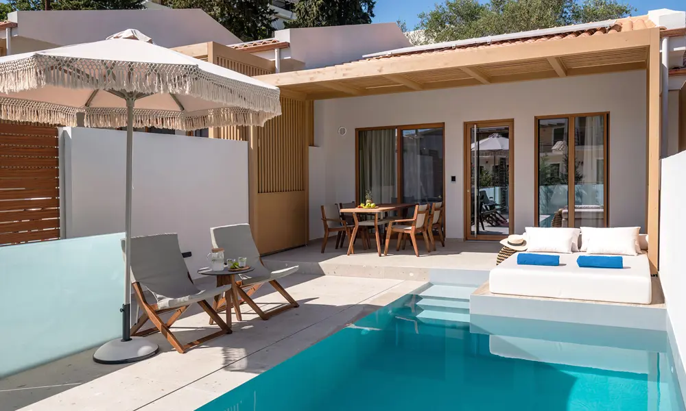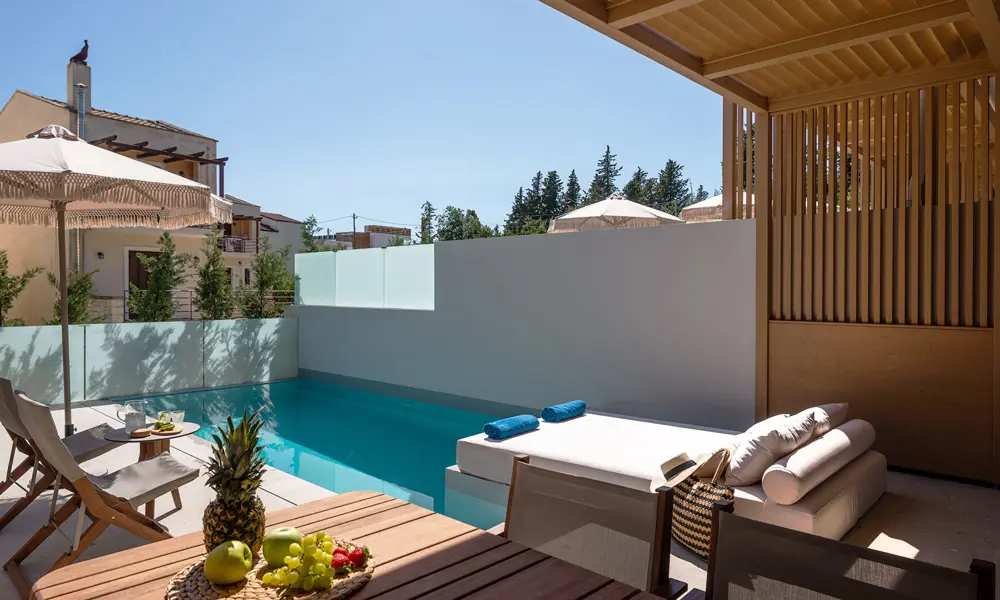 Sivota Kipoi Design Suites har i alt 4 store 1-vær. lejligheder med privat terrasse med swimmingpool. Tre af lejlighederne er 45 m2 og har en 36 m2 solterrasse med swimmingpool. Den fjerde lejlighed er lidt større og er på 48 m2 og har en 52 m2 solterrasse med swimmingpool. I forbindelse med rejsebestillingen kan du mod tillæg vælge, hvilken lejlighed du vil nyde ferien i.