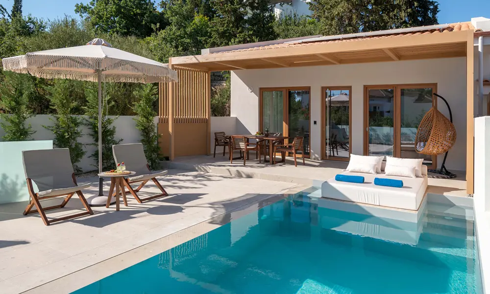 Navngivningen af det nyopførte hotel er ikke tilfældig. ”Kipoi” betyder nemlig have på græsk og afspejler både beliggenheden og indretningen. Omgivet af grønne træer er hotellets fire moderne lejligheder udstyret med private solterrasser på hver 36 m2 og alle med egen swimmingpool.
