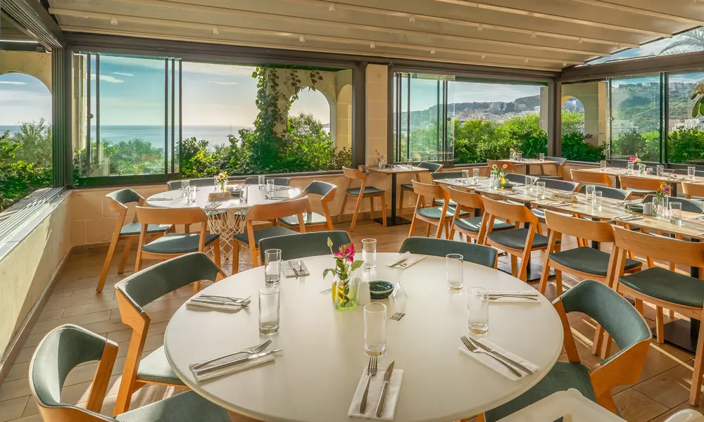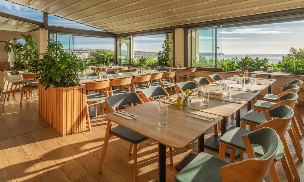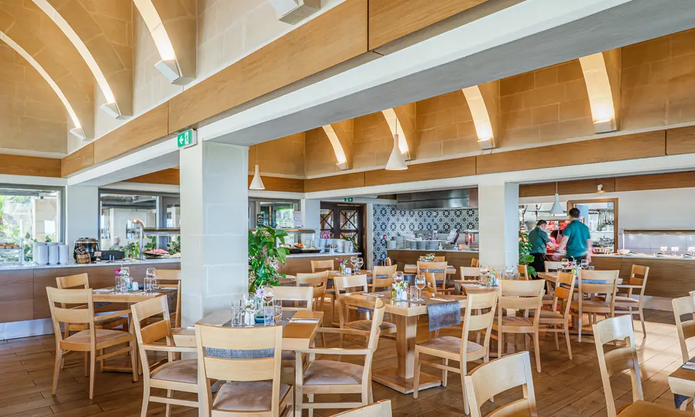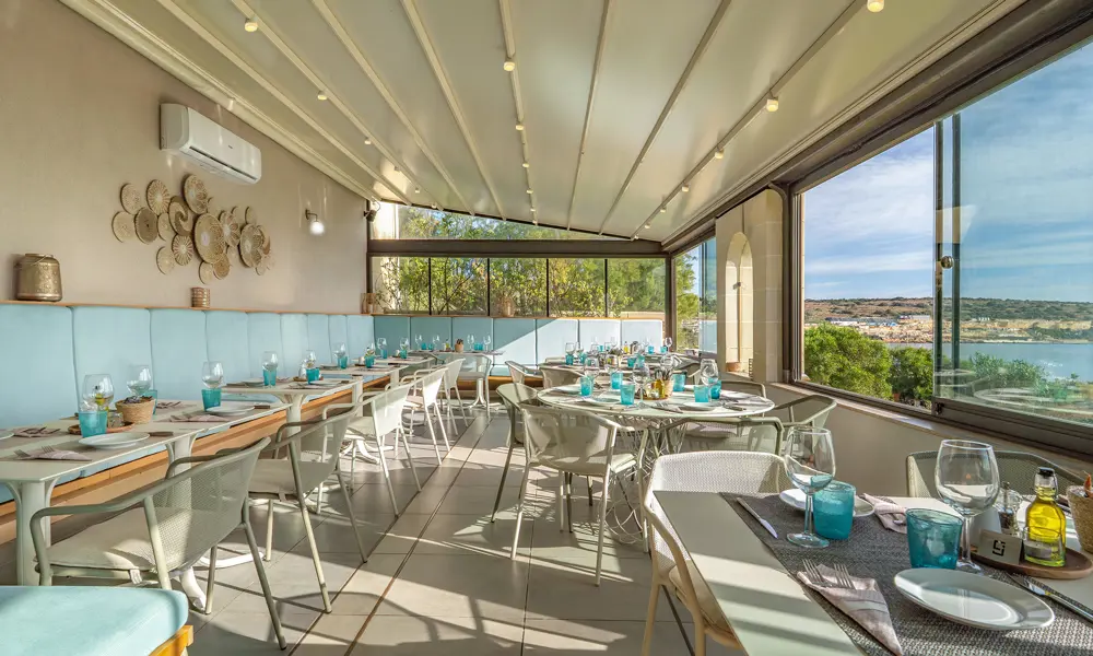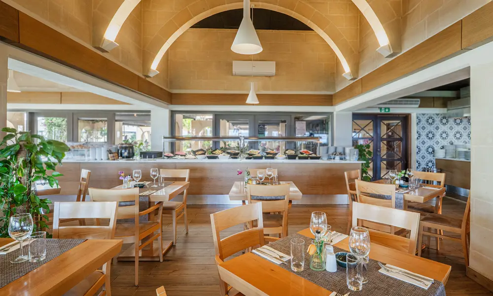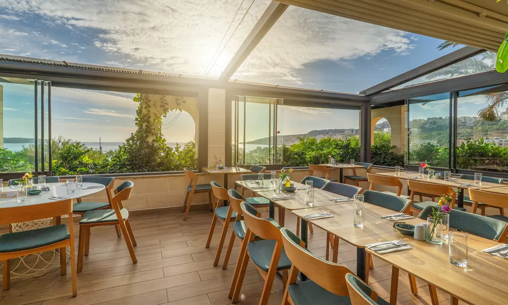 Indenfor sidder du i hyggelige omgivelser med grønne sofaer og caféborde under runde hvælvinger. Udenfor kan du på den store terrasse nyde din mad og udsigten over poolområdet og Mellieha by i horisonten. Især om aftenen, når både pool og by oplyses, er synet hel magisk.