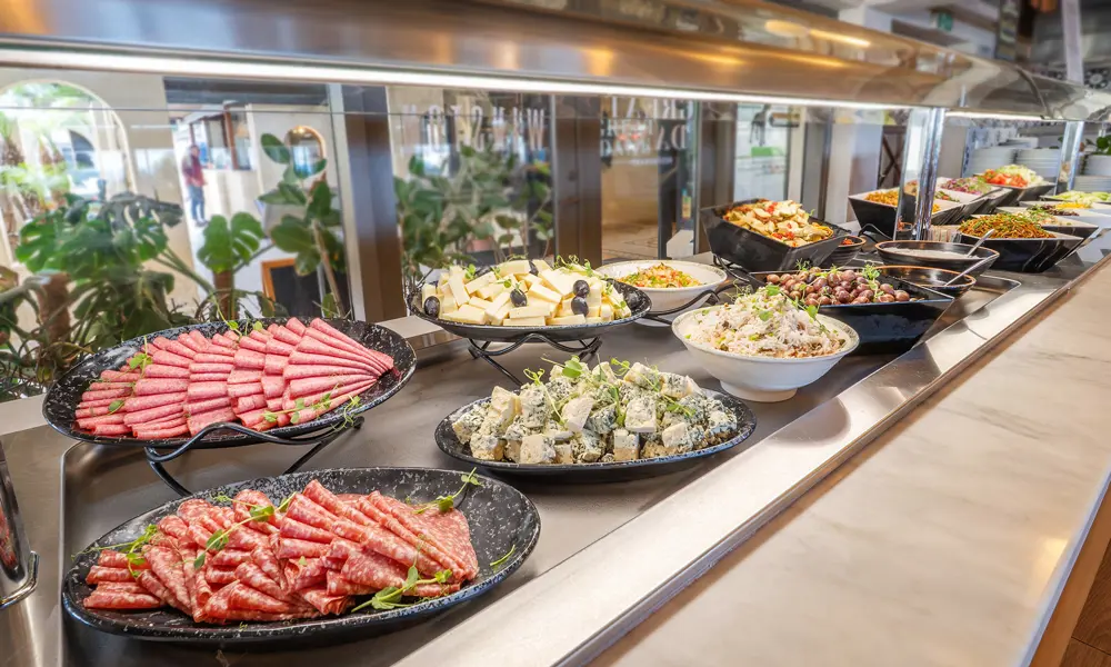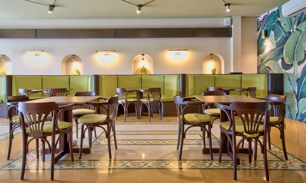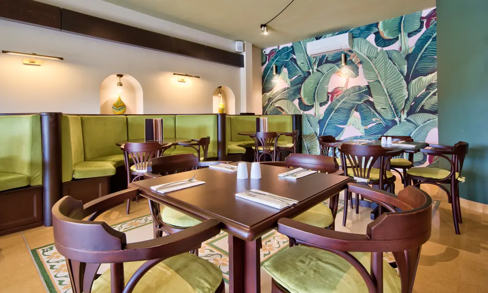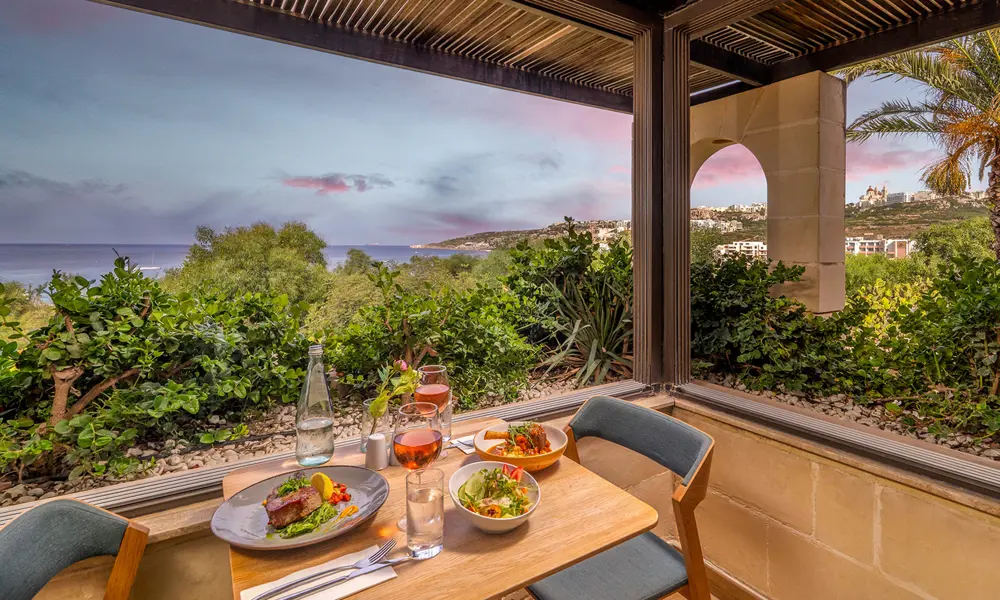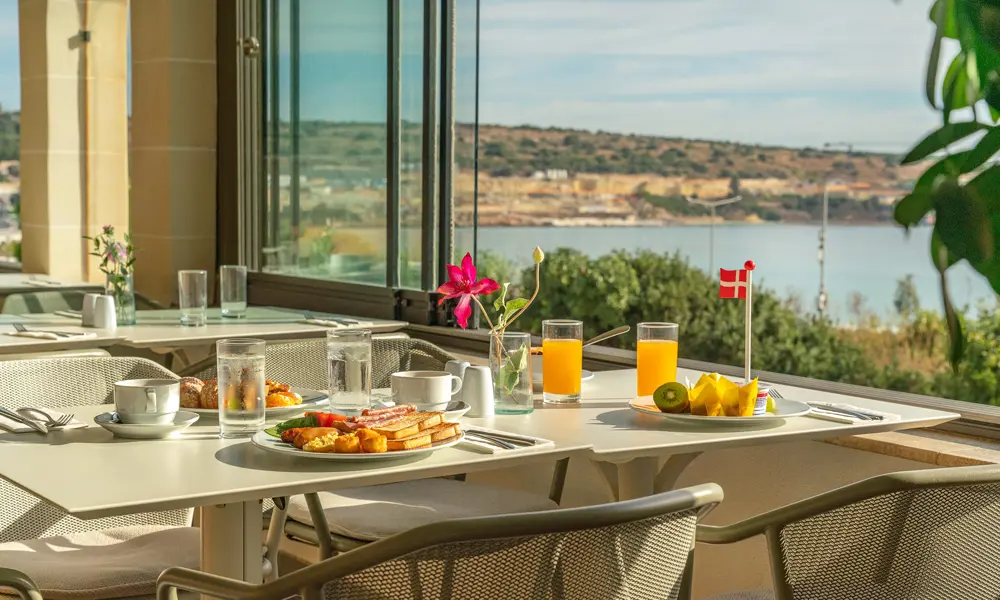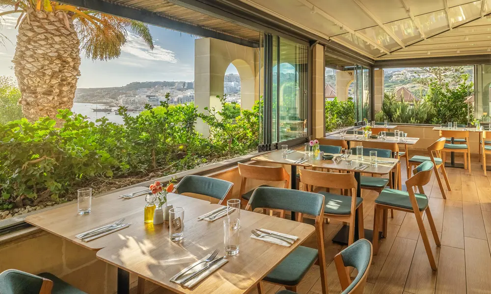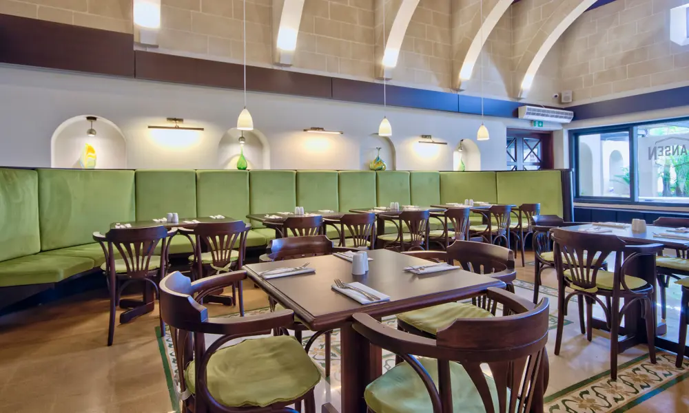 Indenfor sidder du i hyggelige omgivelser med grønne sofaer og caféborde under runde hvælvinger. Udenfor kan du på den store terrasse nyde din mad og udsigten over poolområdet og Mellieha by i horisonten. Især om aftenen, når både pool og by oplyses, er synet hel magisk.